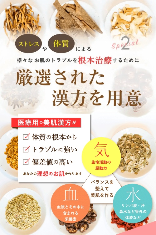 医薬品と漢方薬を組み合わせることで、より質の高い美肌ケアに繋がります。